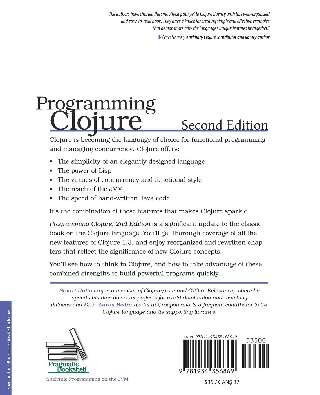 Clojure simplifies multi-threaded programming in several ways. Because the core data structures are immutable, they can be shared readily between threads.. Drowning in unnecessary complexity, unmanaged state, and tangles of spaghetti code? In the best tradition of Lisp, Clojure gets out of your way so you can.. Programming Clojure [Stuart Halloway, Aaron Bedra] on Amazon.com. *FREE* shipping on qualifying offers. If you want to keep up with the significant changes.. 21 Feb 2018 . Programming Clojure is an inspiration of Clojure knowledge and has furthered my understanding of the nuances of Clojure. One of the new.. Programming Clojure 3rd edition by Alex Miller, Stuart Halloway, Aaron . Quick Clojure: Effective Functional Programming by Mark McDonnell. Aug 23, 2017. 71a75d9e82